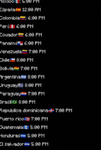 Si tu país no aparece en la lista principal, puedes tomar como referencia el horario EST y ajustar según tu diferencia horaria. Por ejemplo, si tu país está una hora detrás de EST, simplemente resta una hora al horario anunciado.